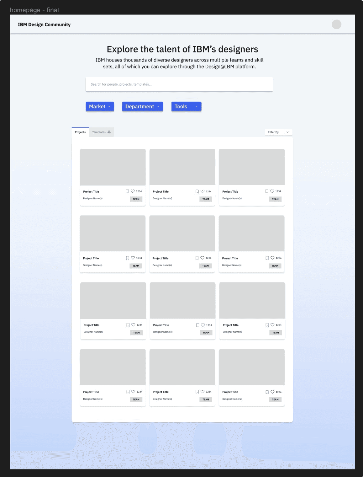 At the next meetings, each of us shared the progress we had made on our respective sections. One of the main points of contention regarding the homepage had to do with the hierarchy of the filters (which ones should be the top level and which one should be the secondary level, as well as how they should be displayed (multiple button vs. dropdowns). The below image was what Esha and I finally decided on based on the feedback. We included a search bar so users could look for specific projects, dropdowns to represent the different markets (national, pub-fed etc.) that projects fall into, and the tools that were used for the project. We also implemented a tab structure to separate projects vs. templates/resources that could be duplicated and used by a wider audience. The sub-filters are grouped with the tabs to allow users to sort by metrics such as recency, number of likes, alphabetical etc. The filters used in this design were placeholders based on what we thought would be useful based on our time at IBM, but this structure would allow for the full time designers that adopted the project to adjust them as they saw fit.