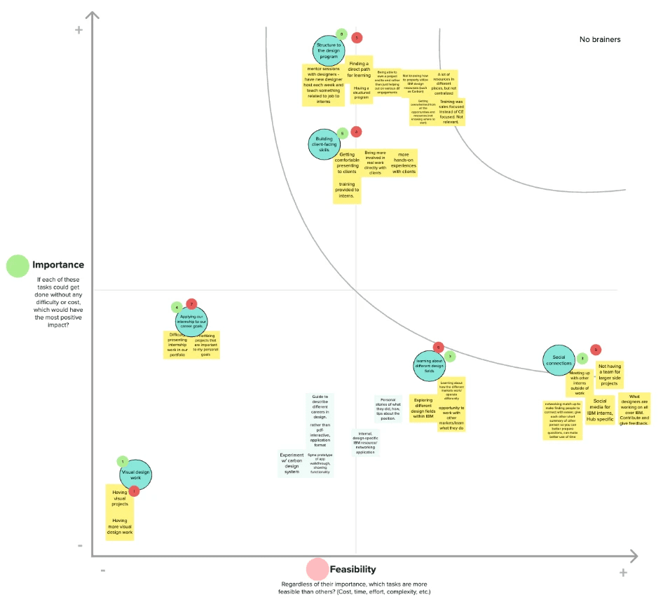 Given that we were working within a limited time frame, and that this was going to be an extra side project for all of us, I led an activity for us to prioritize each of the problem statements based on both importance and feasibility. This would allow us to gauge how much effort each of our generated ideas might take and whether they would really make an impact on our target users (the full time designers). To decide on these placements, I had everyone vote on a scale of 1 (least important/most feasible) - 5 (most important/least feasible) for each of the two metrics.
