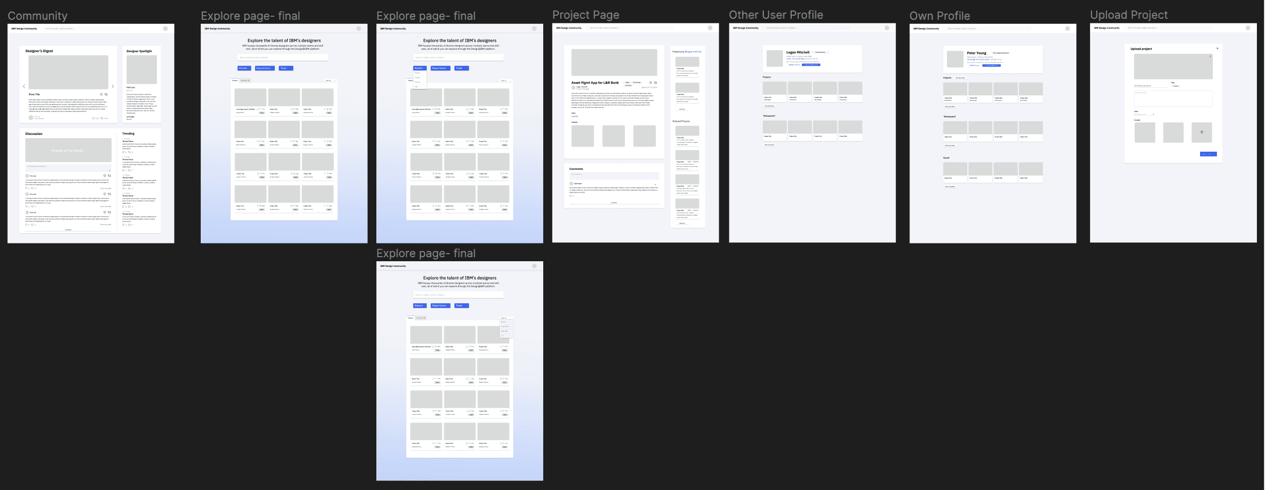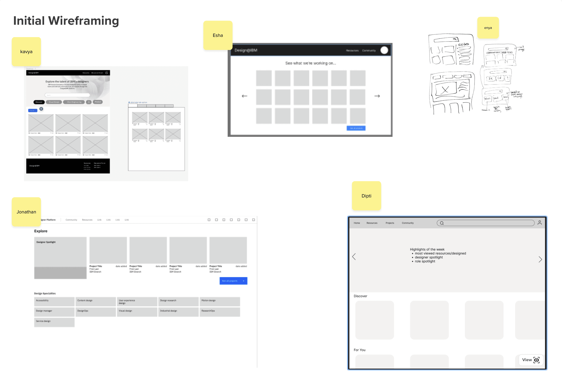 In our small group, I led multiple brainstorming sessions to figure out how we wanted to tackle our problem. We tried to generate a range of ideas, from the simplest we could think of (simply creating an infographic detailing the different design fields/work individuals do at IBM), to the most complex idea we could think of (an internal Tinder-style app where designers could "match" with other designers to start conversations and make connections. Because there were a wide variety of ideas, we voted on one that fell somewhere in the middle of the spectrum — emulating a Dribble/Behance style platform for internal IBM use so anyone can view the work of other IBM designers and share resources.