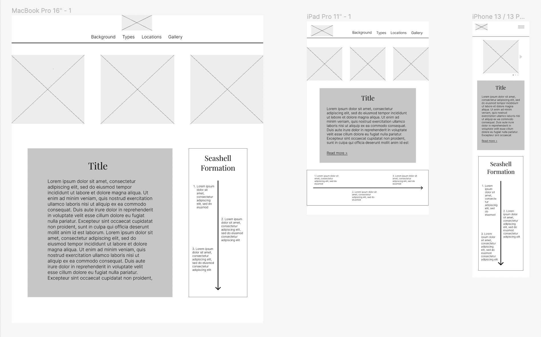 After observing other websites, I chose to implement a combination of the column-drop and mostly fluid layouts on my own site because it felt the most intuitive for the content I had planned. I created a lo-fi wireframe for mobile, tablet, and desktop so that I had a vision of what it would look like before I began my implementation.