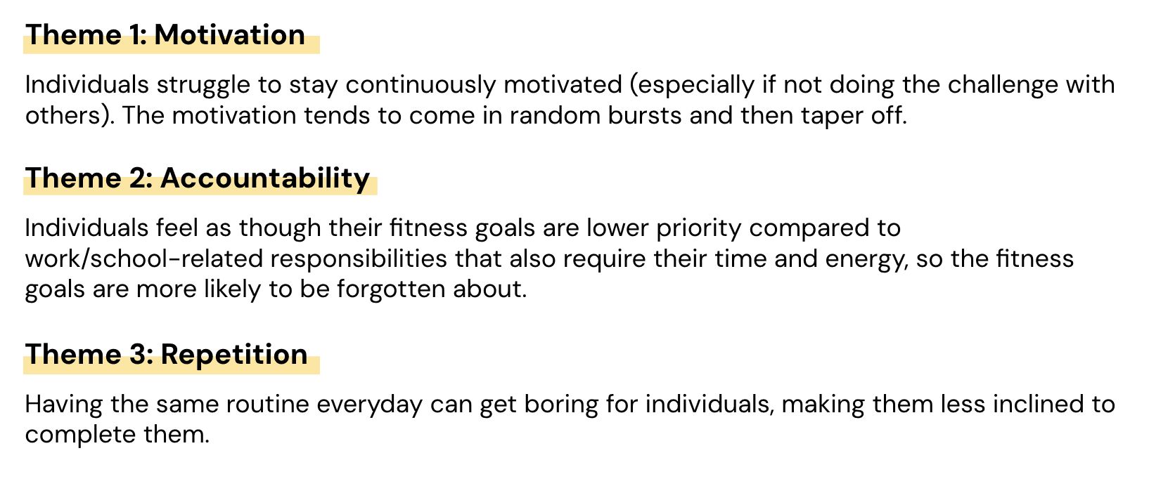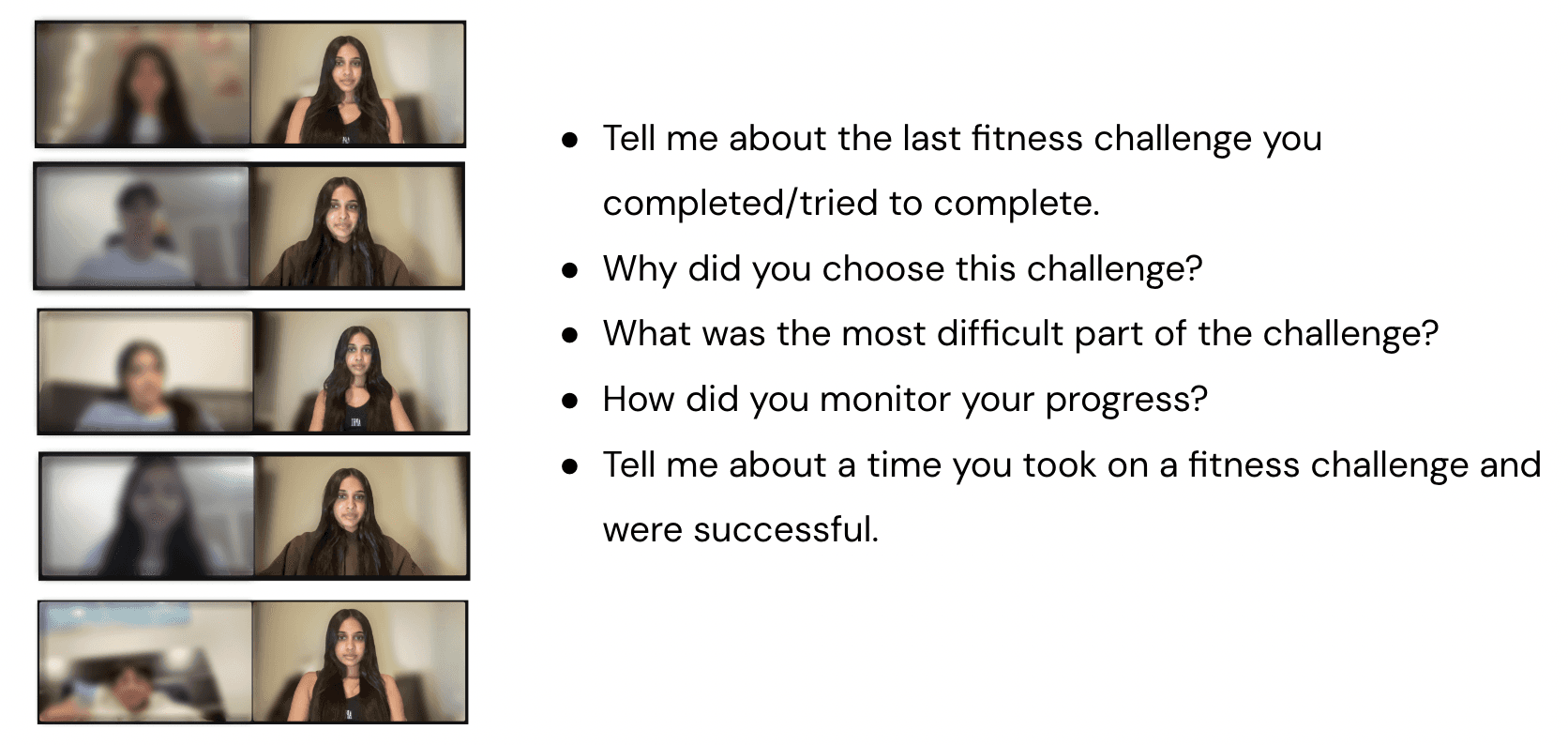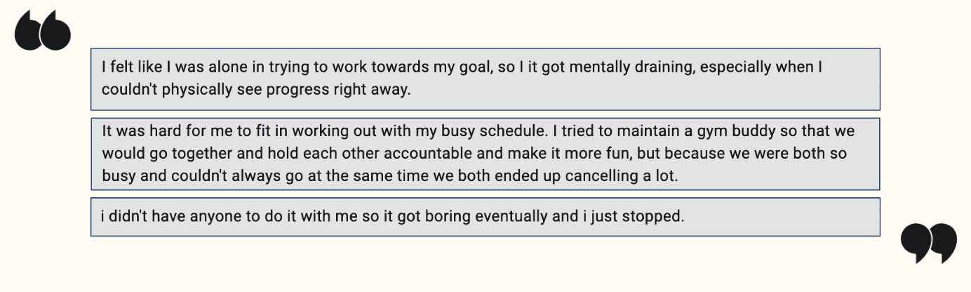Now that I had a more refined problem space and a better understanding of the landscape, I decided to conduct user interviews with individuals that fit my target user to hear about their experiences and better empathize with them and their needs. I conducted 5 interviews with individuals that I knew had set fitness related challenges for themselves at various points of time so that I could listen to them talk about their experience.