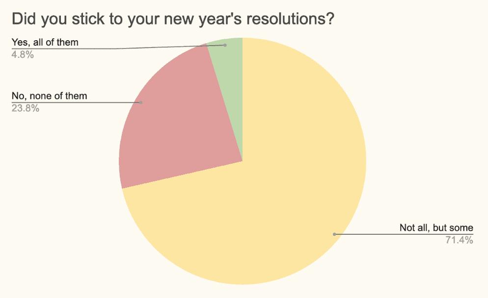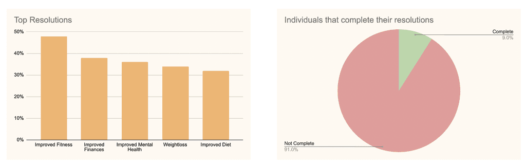 I supplemented these findings with research papers I found online. In an article by Forbes, they write that "More people cite improved fitness as a top resolution (48%) compared to improved finances (38%), improved mental health (36%), weight loss (34%) and improved diet (32%)". Another article from the Fisher College of Business stated that "researchers suggest that only 9% of Americans that make resolutions complete them. In fact, research goes on to show that 23% of people quit their resolution by the end of the first week, and 43% quit by the end of January."