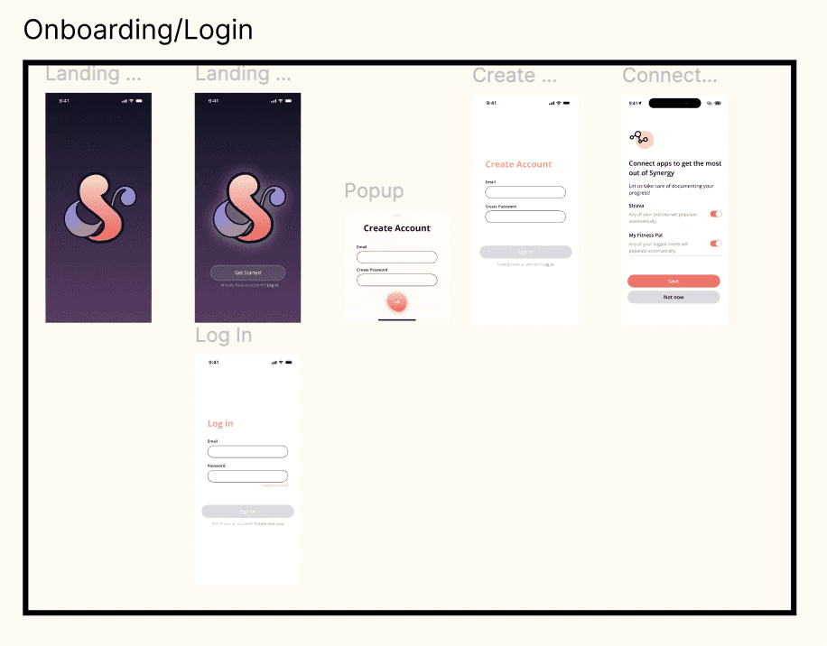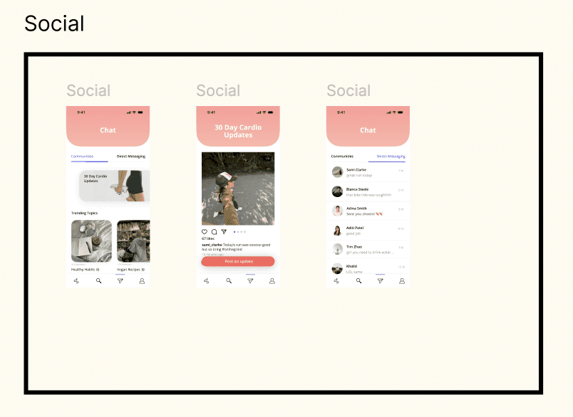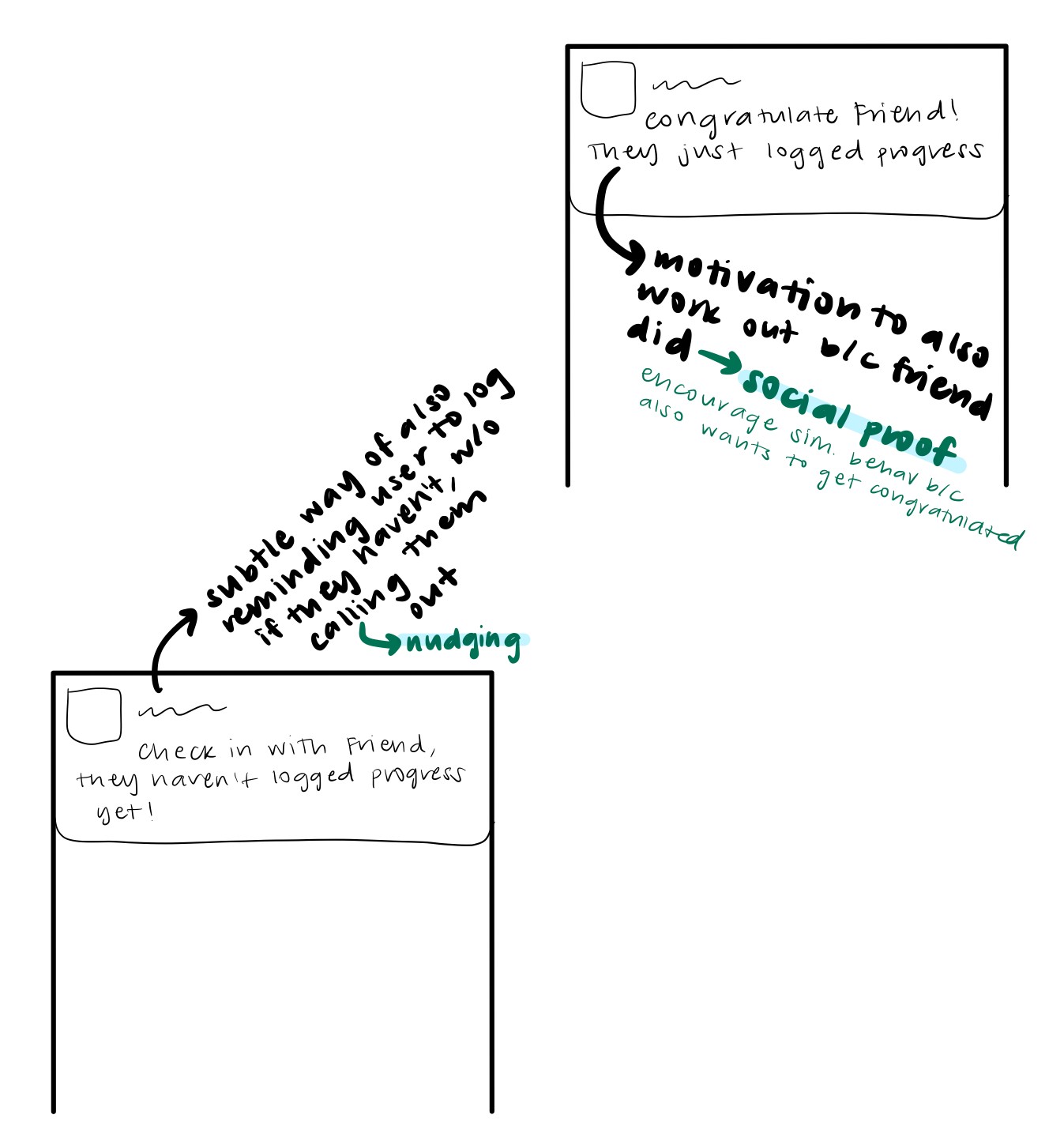 I began with loose sketches to figure out what some of the main interactions would look like before I moved to Figma. These sketches helped me start planning how to break down features and pages, as well as think through the user journey. Since one of the main user needs was motivation, I also thought about some of the notification interactions I'd want the users to experience and how that would play into features in the app. I considered how I could apply psychology concepts I had learned in class, such as social proof and nudging, to influence user behavior. After I had written out what some of these notifications might look like, and I backtracked from there to think about what features in the app would allow those notifications to be plausible interactions. I realized that a key feature was going to be a way to check in on your friends' progress, as well as a low-effort means of rewarding each one another for following through.