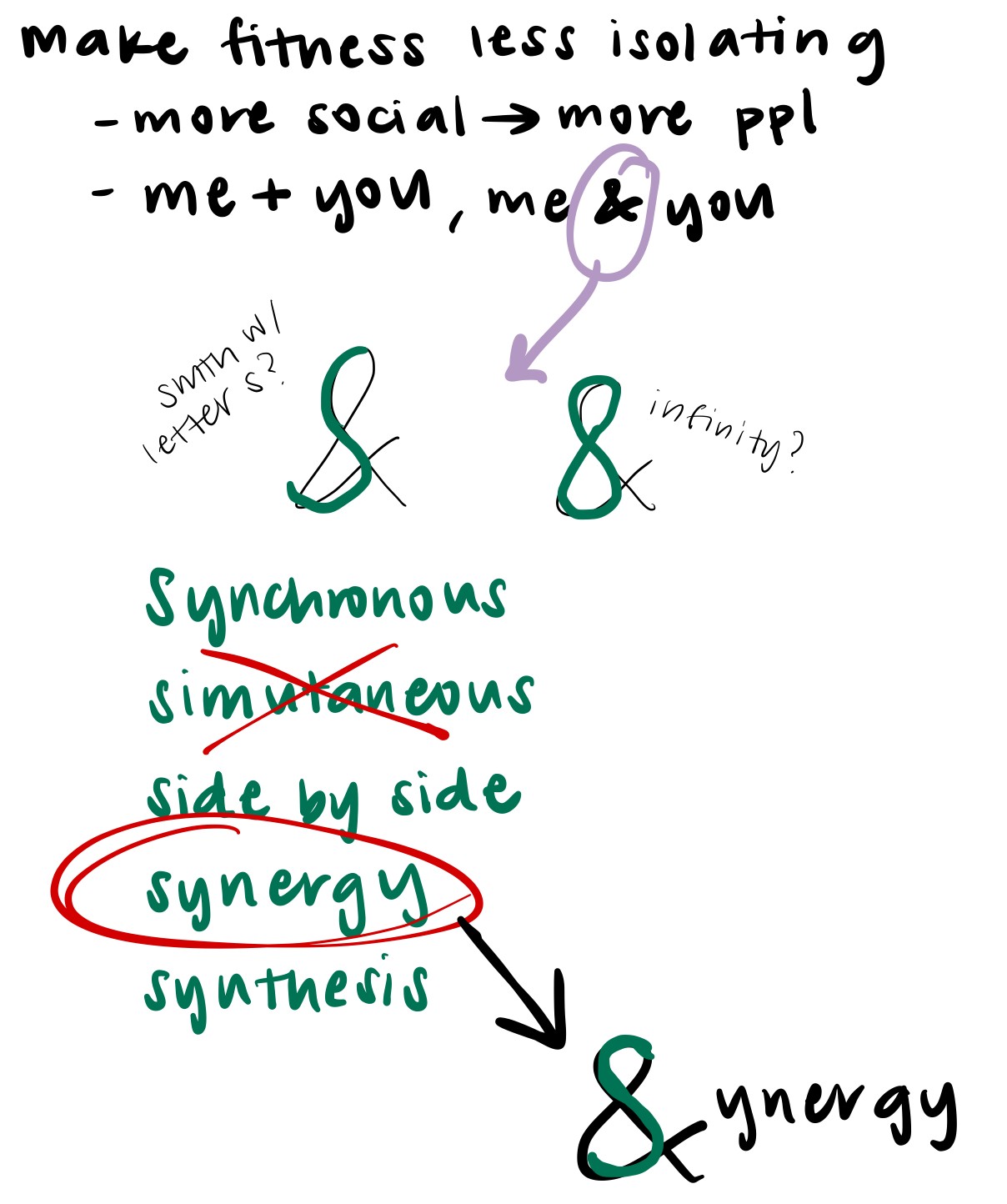 Before I jumped into designs, I took some time to think about what I wanted the branding of my app to be. I wrote out words I associated with the concept, and what stood out to me as a common pattern was the word "and". This word can also be represented as an ampersand. I then noticed that an ampersand resembles either an infinity sign or the letter "s". At first I was partial to the infinity sign because the app represented a constant back and forth between everyone in the community to empower and uplift one another. However, as I thought about words that started with the letter s, I was really drawn to the word "synergy". Synergy is two or more parties working together to create something greater than any of them could do independently — which is exactly what I was aiming to do with this platform. Each individual user is made greater through the support from their community.