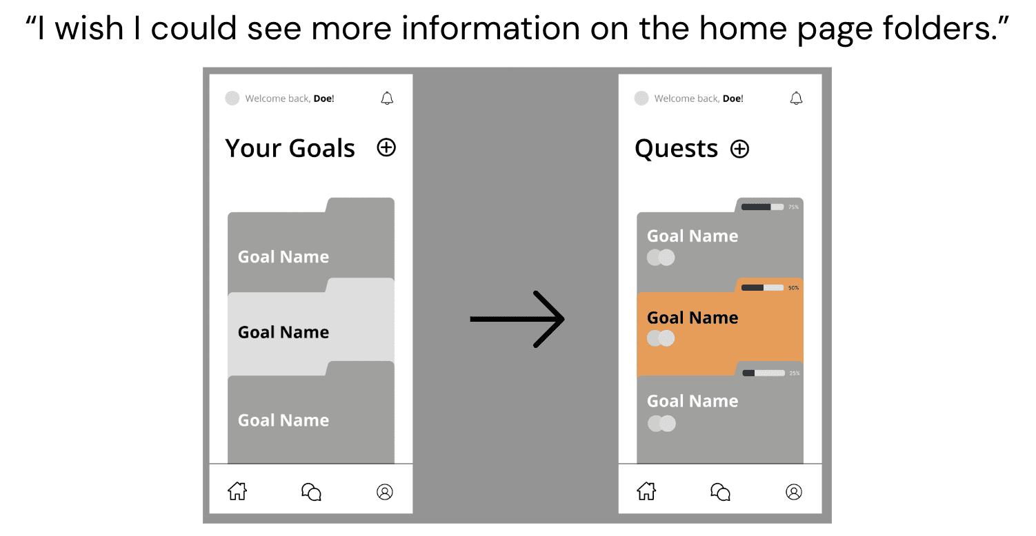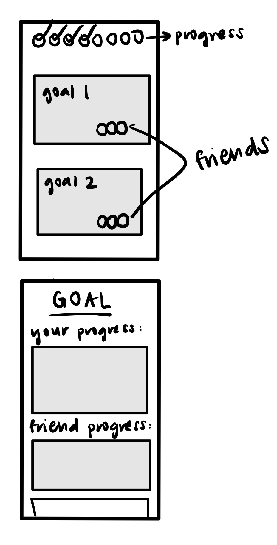 From the sketches, I created a lo-fi prototype in Figma that had 3 main features. The ability to set goals for oneself, the requirement to add accountability partners for each of those goals, and a social feature to allow those working towards the same goal to stay connected. I ran 4 user testing sessions with my lo-fi prototypes. Some of the main design changes that came out of those sessions are as follows.
