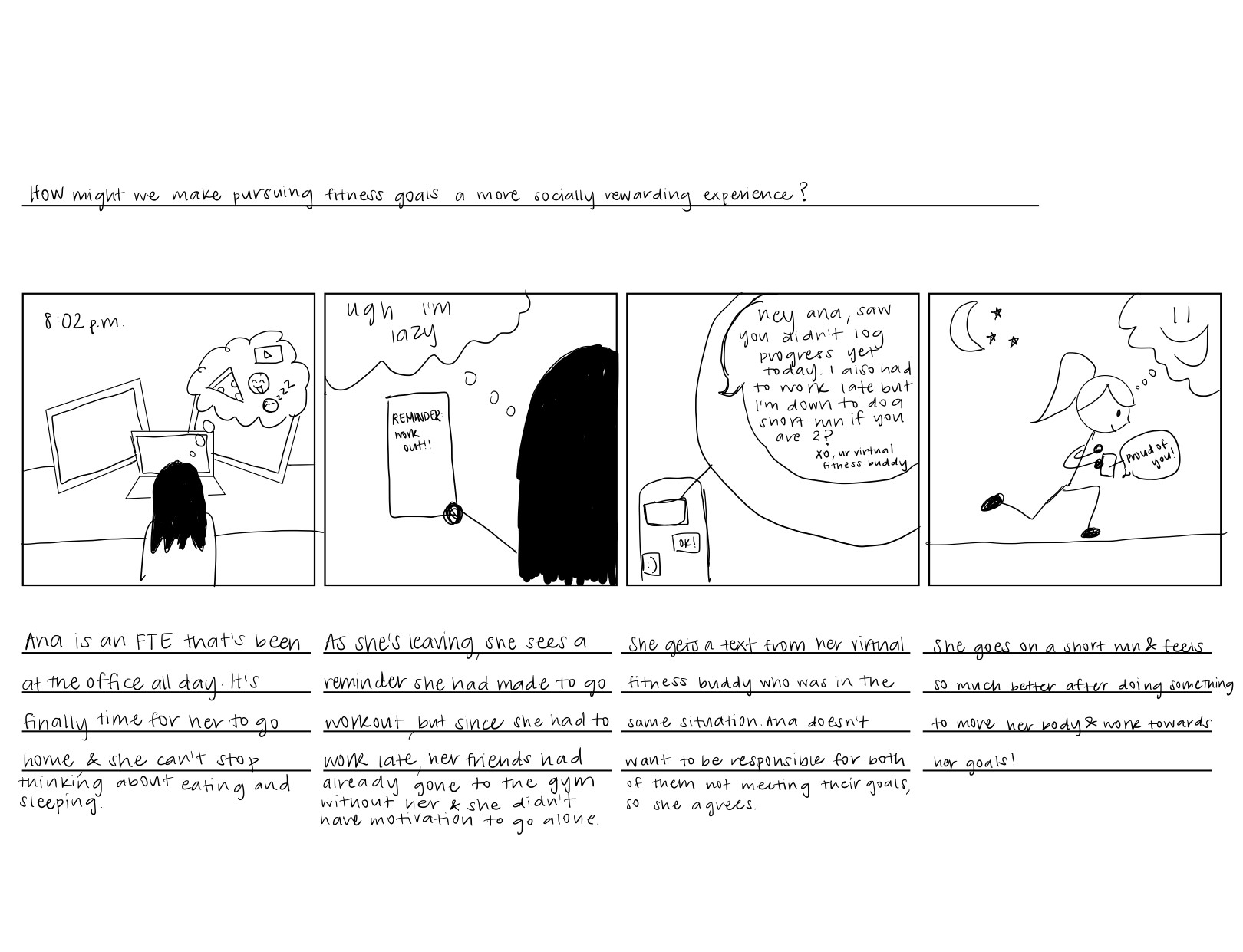 Now that I had an overarching question, I drew out storyboards to begin conceptualizing what an interaction to combat the feelings I outlined in the user journey might look like.